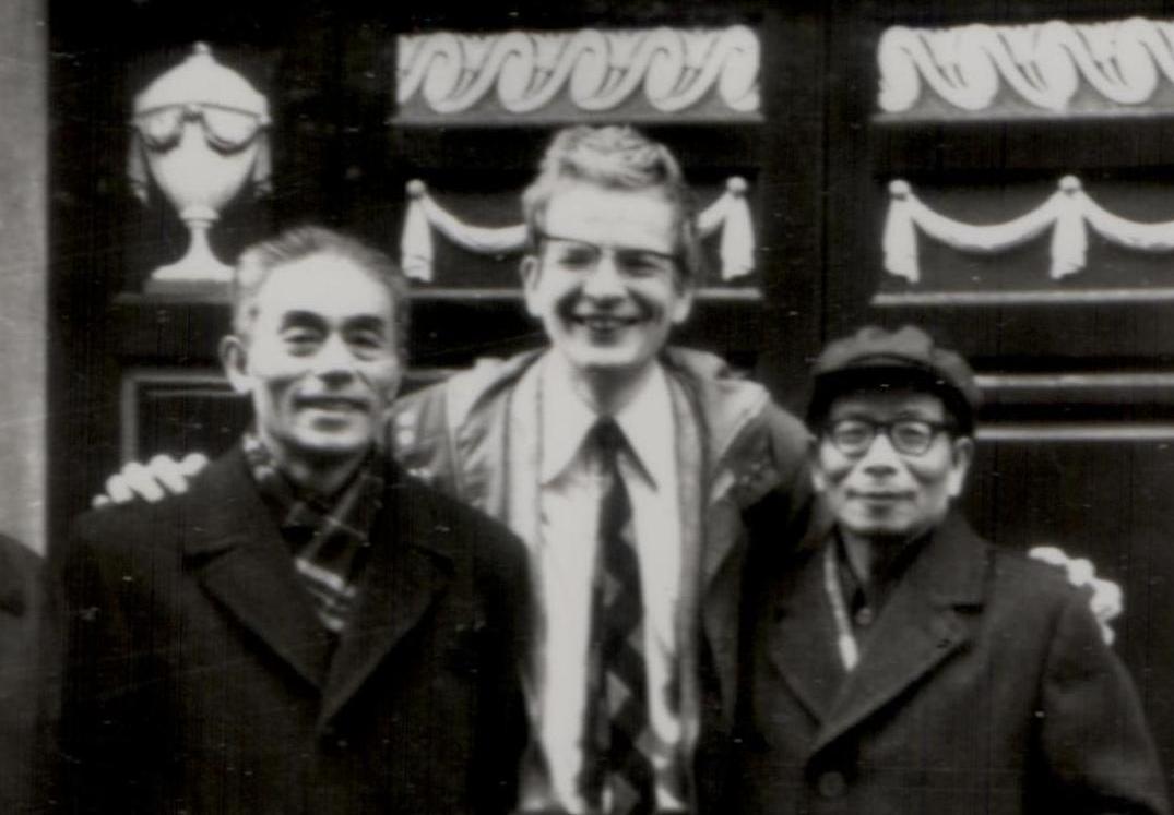 ![]() Xie Huaishi (rechts), der größte Zivilrechtler der VR China(1919-2003), und sein Institutsdirektor Sun Yaming (1913-1991), mit ihrem Dolmetscher Frank Münzel, 1979 |